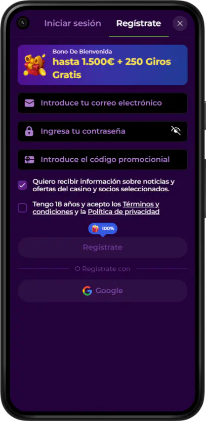 - Free spins sin depósito: se ofrece 100 tiradas gratis sin ingreso obligatorio, valor total aproximado de 20 €, mediante un código promocional específico, el cual se puede encontrar en la cuenta personal de jugador.